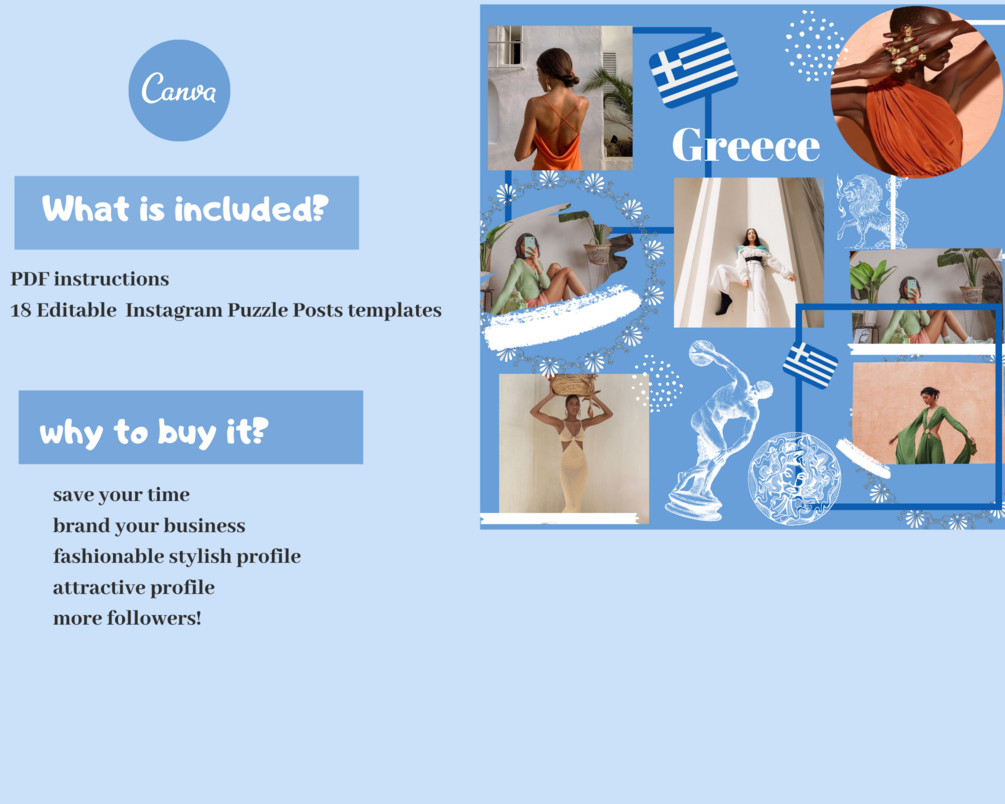 Greece Instagram Puzzle, Feed Template,Travel lovers ,digital File IG posts Template,Instagram posts puzzle ,Editable templates on canva